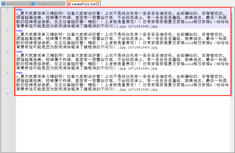 批量重命名,在需要批量重命名的资源的同级目录下新建一个renameFiles.bat文件,打开文件,将Excel中生成的第三列中的数据复制到里面,保存并双击执行,这时就会批量重命名文件了